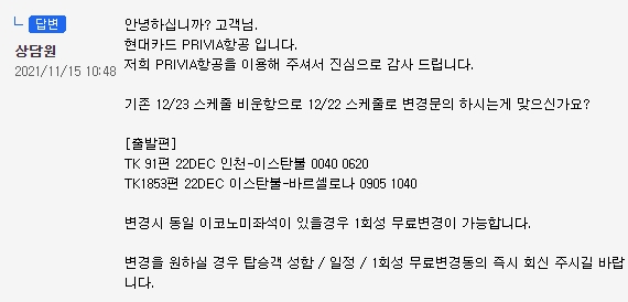 변경된 항공일정에 따라