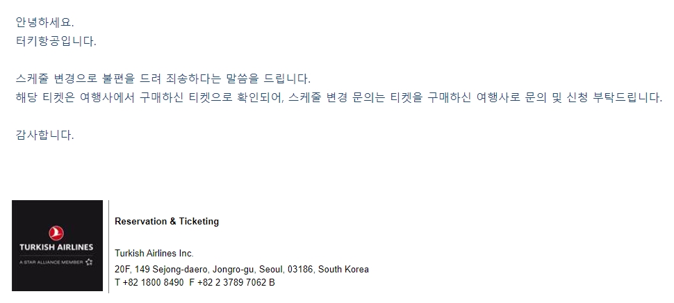 터키항공 한국지사 메일 주소는 SELSALES@THY.COM 이다.