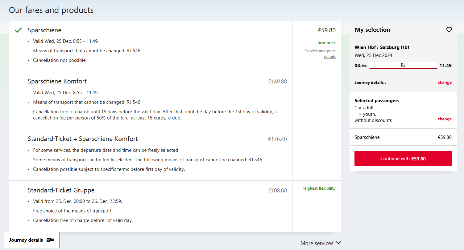 오픈 당시는 직통 열차는 두 명 기준으로 (청소년 선택했지만..할인이 없음 ㅠ.ㅠ) 59.8 유로부터 시작이었다.
